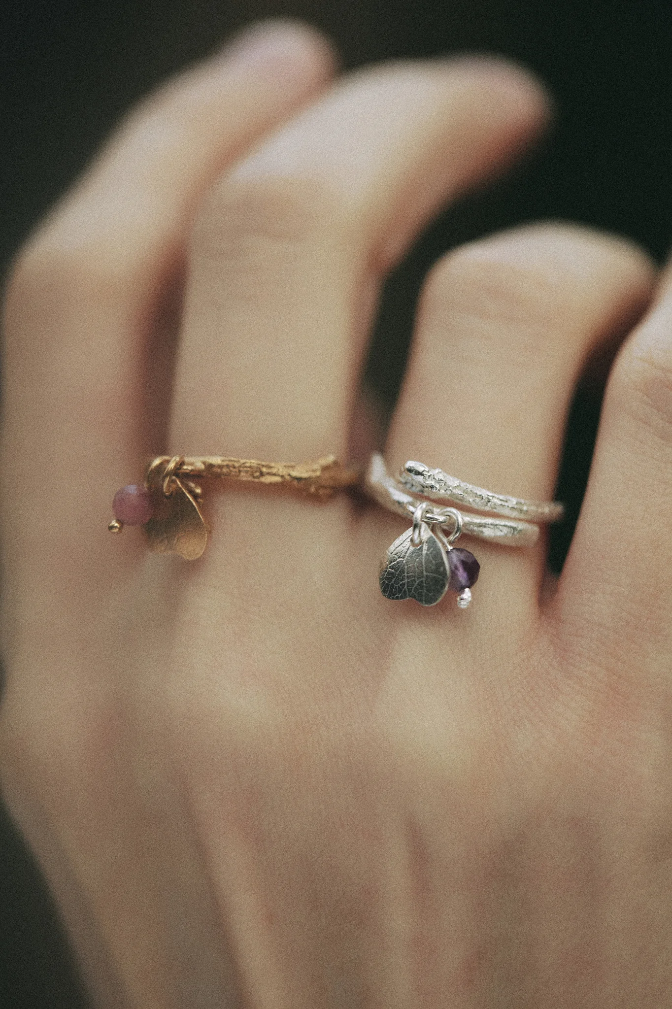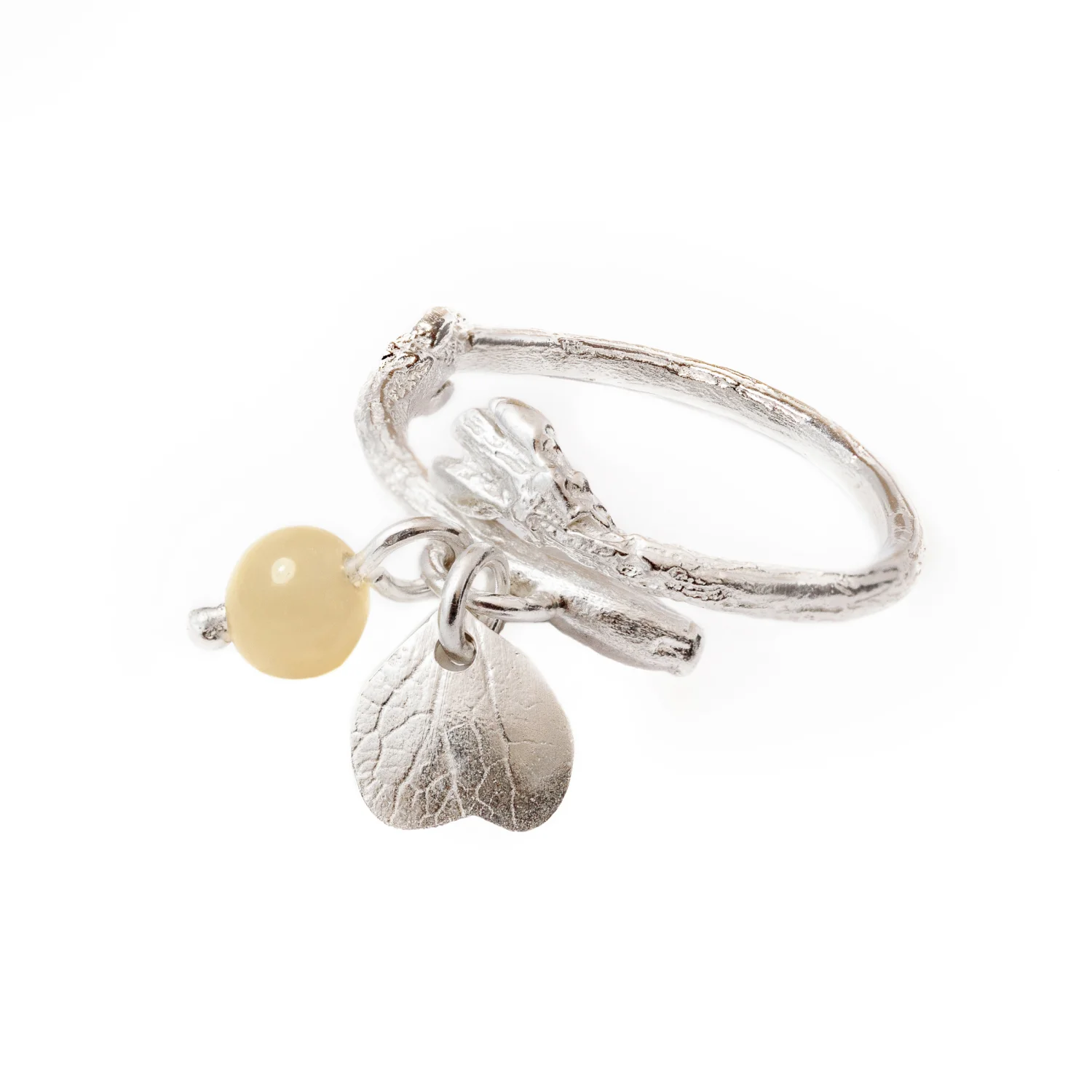to oplatająca palec delikatna gałązka kaliny ( gałązki wybraliśmy z krzewu rosnącego w naszym ogrodzie :). Jest wyjątkowy przez ruszający się (jak listki na wietrze) płatek kaliny w kształcie serca i wybrany przez Ciebie kamień bądź bursztyn.