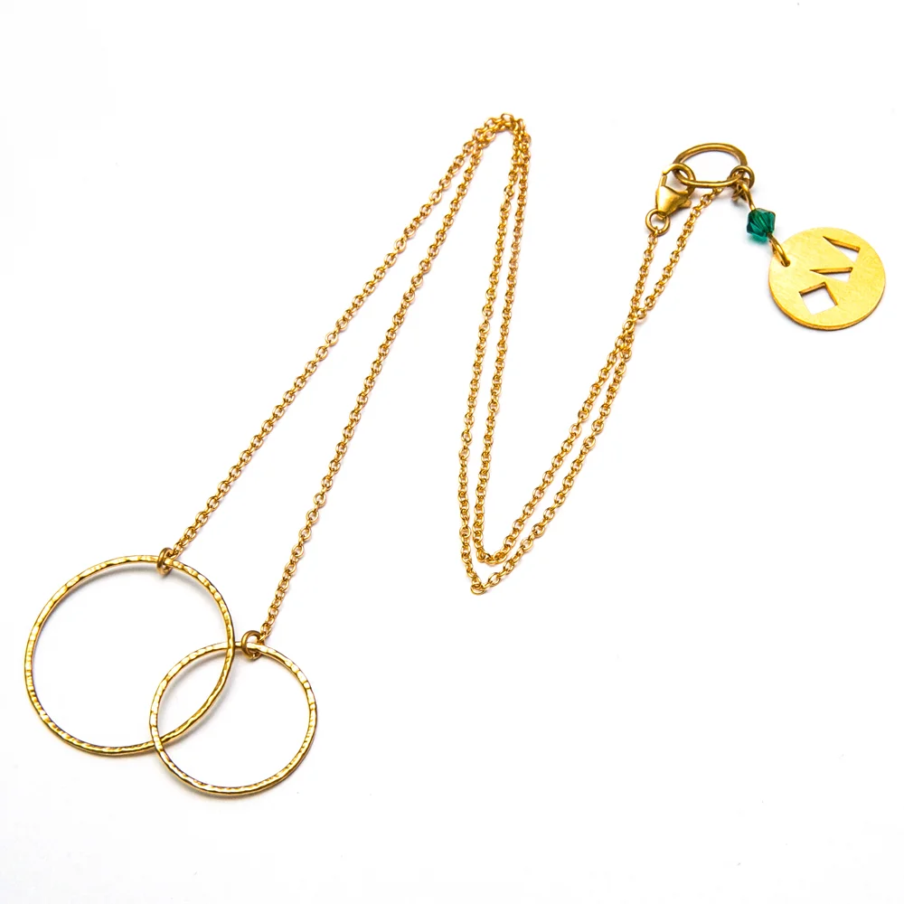 Naszyjnik jest wykonany ze srebra próby 925, lutowany a następnie młotkowany, co nadaje metalowi niepowtarzalną fakturę. Następnie jest pokryty warstwą 24 karatowego złota. Jest leciutki, trwałyi bardzo wygodny. Na karku będzie się mienił kryształek Swarovski w kolorze szmaragdowym z oryginalną zawieszką OM. Możliwość zamówienia innego koloru kryształka.