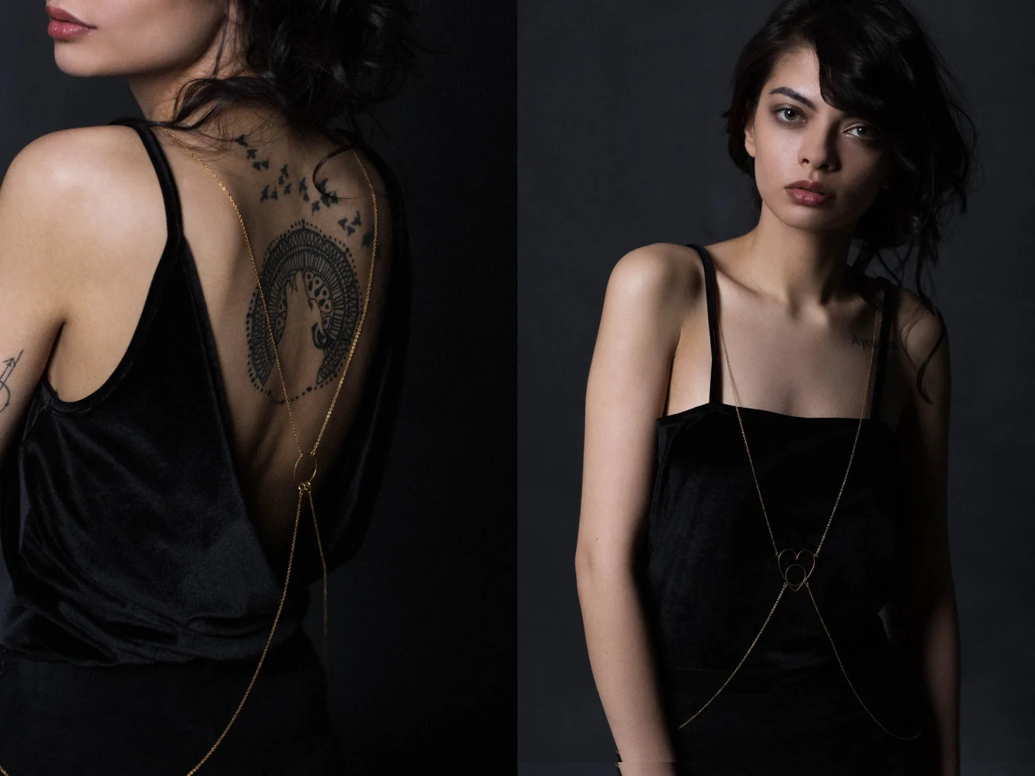 Heart body piece to unikatowa biżuteria na ciało. Piękna, subtelna i wygodna. Wykonana jest w całości ze srebra, a następnie pokryta 24kr złotem.