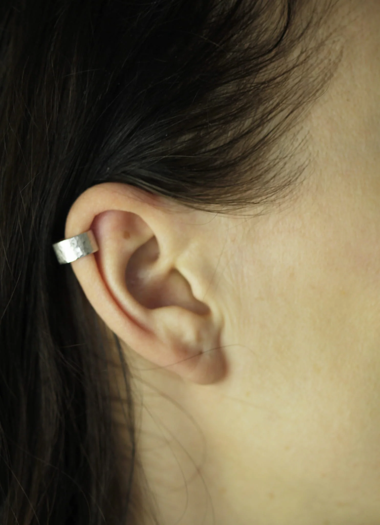 Prosta, pojedyncza nausznica, wykonana ręcznie ze srebra 925. Nie wymaga dziurki w uchu. Wygodna i wyjątkowa. Każda jest młotkowana co nadaje jej unikatowy wygląd i przez co pięknie się na niej załamuje światło.