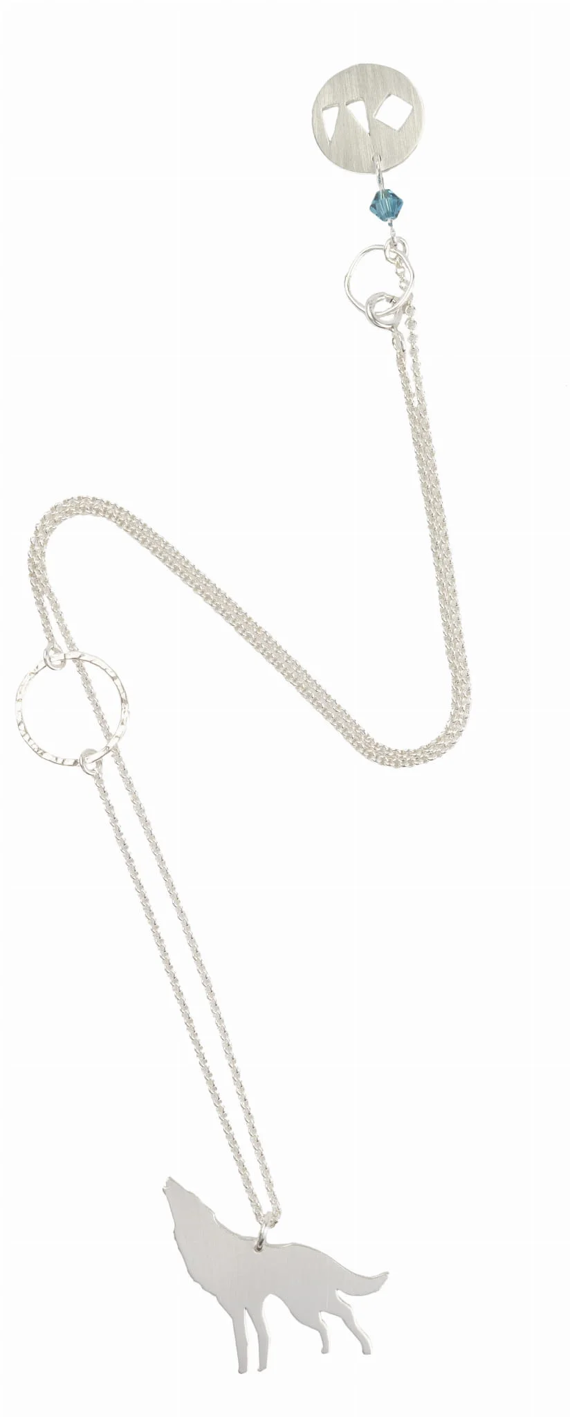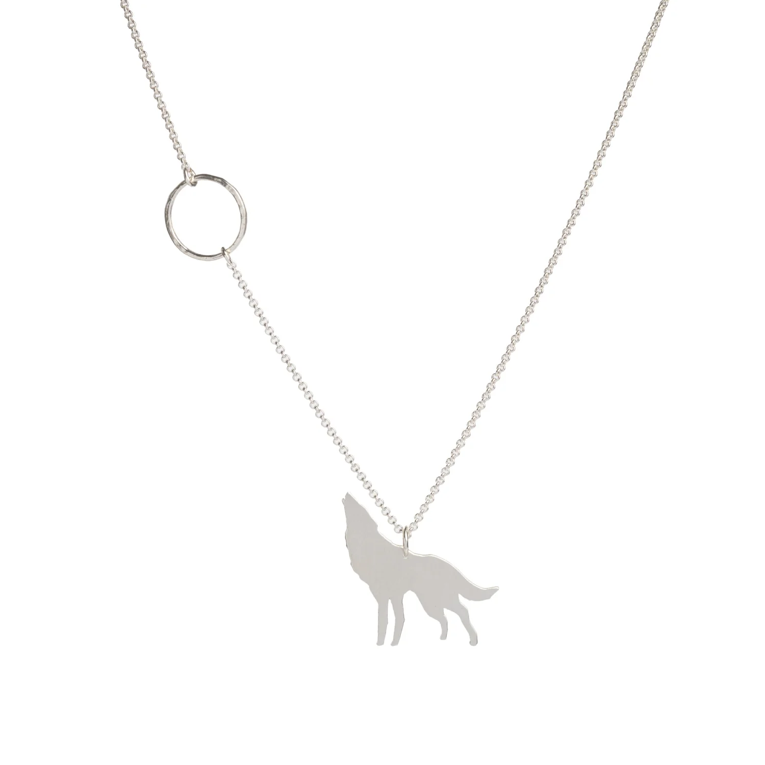 Piękna i dzika. Wilczyca na łańcuszku z ręcznie robionym, młotkowanym okręgiem niczym księżyc w pełni. Cały naszyjnik wykonany jest ze srebra próby 925.